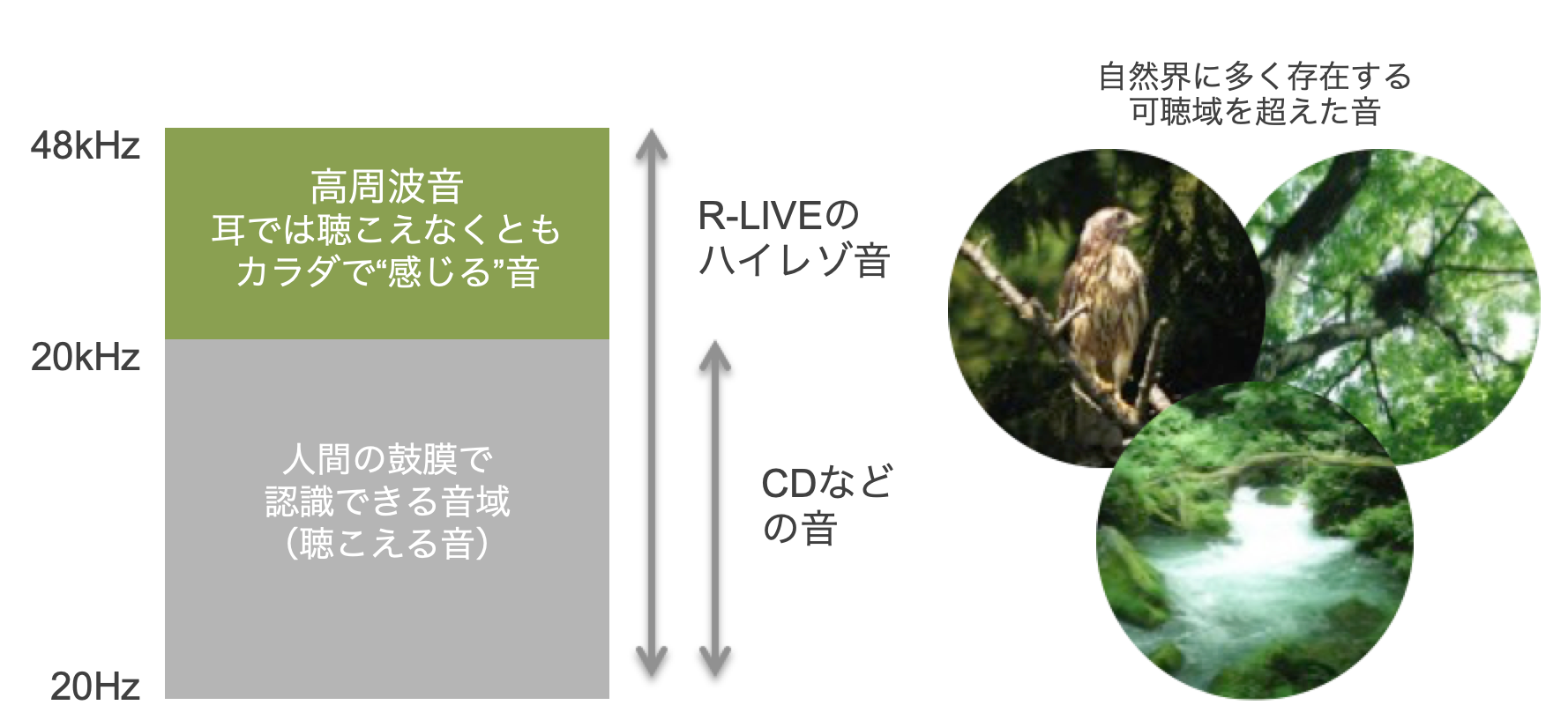 従来のCD音源やインターネットの配信音源には、人間の耳(鼓膜)で感知できる20kHz以下の周波数しか含まれていませんが、R-LIVEのハイレゾ自然音は48kHzまでの”感じる音”を含み、空間に森と同じ心地よさを再現することができるのです。